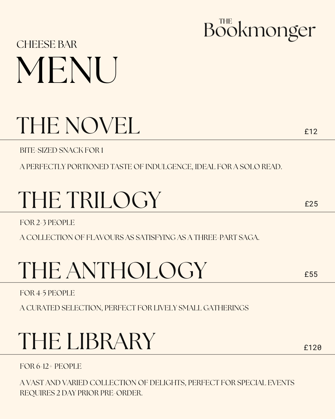 In store you can order The Novel, The Trilogy and The Anthology. Just pop in and we can make it for you to take away or perch at our bar and enjoy in the shop. You can also order any of these sizes in advance with 2 days notice.